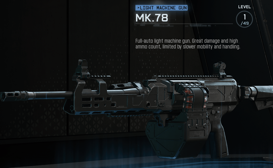 The Mk. 78 is the heavy option in the arsenal, designed for sustained fire and locking down lanes. It boasts excellent damage output and a massive ammo pool, but that comes at the cost of slower mobility and handling. With the right attachments and perk setup, the Mk. 78 becomes a reliable choice for anchoring objectives and suppressing opponents at range.