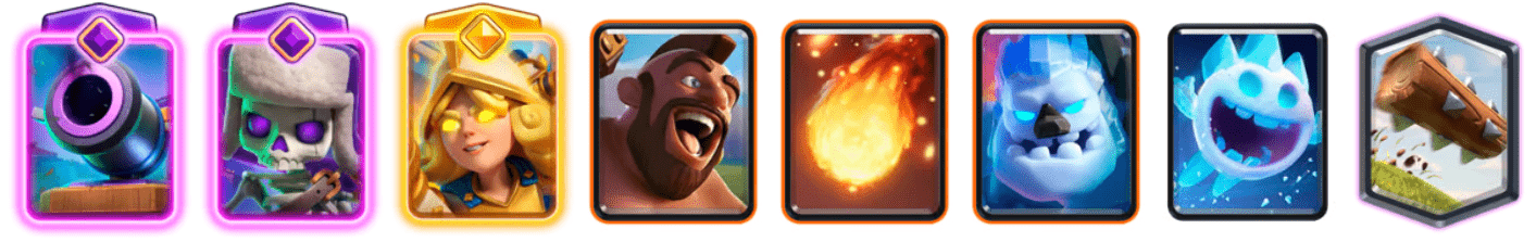 Most of the time, you will need just an Ice Golem/Ice Spirit and a Hog Rider for a good push. Where this deck shines is in its defensive game. Evo Cannon is still very strong, even after the nerfs. It kills tanks really well. You can swap this card for Evo Tesla if you want to defend both ground and air. It’s much stronger in the meta now. Drop your Evo Skellies after baiting out spells and pressure your opponent even more. Hero Musketeer is a true gem of this deck, as she provides long-range coverage and anti-air capabilities, which are very valuable in 2v2. Use your spells cautiously. Cast Fireball on support troops or grouped units behind tanks. Avoid overlapping it with your teammate. Clean the swarms with The Log. This deck shines if you can kite your opponent's units well. Use Ice Golem to lure the enemy units into Cannon’s range. Freeze them with Ice Spirit and create windows for Hog Rider.