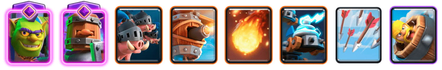 It’s a classic Hog Rider deck, but now with the addition of Hero Musketeer, which fits it really well. It relies on a fast cycle while applying constant and low-risk pressure. Same as with the previous deck, Hog Rider is your primary wincon. Same logic, use him when the opponents are busy defending from your teammate. It’s another “safety net” deck that maximizes your defense while remaining flexible enough not to rely on perfect coordination. Check out this Clash Royale 2v2 meta deck: