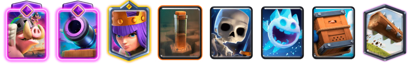 Evo Royal Hogs are your wincon, just like in the previous deck. Split them between the lanes to apply pressure and force multiple responses, draining the Elixir. Earthquake removes the buildings, slows defenders, and paves the road for RHogs. Defensively, Evo Cannon is your anchor. Shuts down tanks, pushes, bridge spams, all for a low cost. Archer Queen adds single-target damage, especially if you manage to preserve her ability for key moments. Skeletons and Ice Spirit stop pushes, absorb damage, and help you kite troops to Cannon. Royal Delivery adds extra annoyance for your opponent, as it provides area denial and knockback. Use The Log as usual, to clear swarms and help RHogs even further.