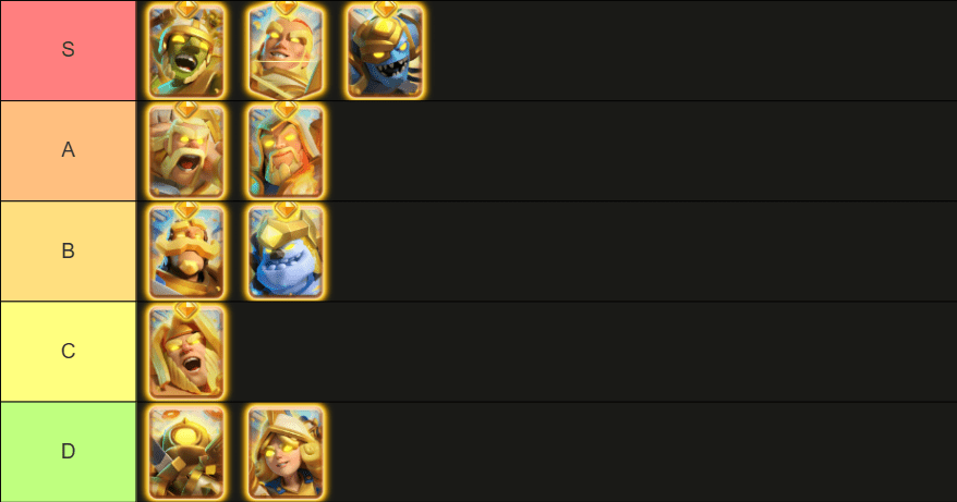 S-Tier Heroes are absolute meta, and the best hero card in Clash Royale is Hero Goblins. They are just OP even after minor nerfs. A-Tier Heroes are very strong cards, only falling short behind S-Tier. B-Tier cards are your workhorses. They’re usually not the centerpiece of the deck, but they do their job right. C-Tier is just Hero Giant, cause he’s not as bad as D-Tier heroes, but he’s not good enough to put him in B-Tier. Honestly, I’d say you still can build a somewhat viable deck, even with bad cards. If you think you’re unlucky after picking a wrong card given out for free, check out our deck list, and you might be pleasantly surprised.