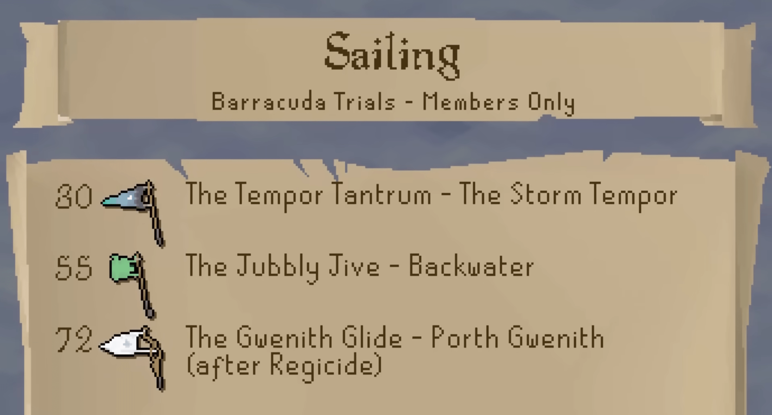 Overall, Sailing functions as a broad progression system that links navigation, upgrades, travel, and gathering into a single loop. It gives players new ways to explore Gielinor, new resources to work with, and new methods to support other skills while progressing from early ships to powerful, fully-equipped vessels. Let me know when you want to move on to the Level 1–99 section.