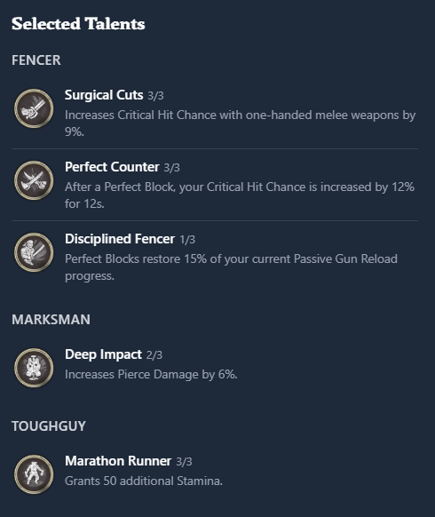The last 2 points can be used anywhere you like, but I prefer to use them in Deep Impact to further increase damage. This build plays around parrying, but by this point, you should be pretty good with it. If you’ve upgraded your Sturdy Rapier, you should get 51% of landing a crit with this build. I really enjoy this build cause it’s super strong, but at the same time isn’t an auto-win button, so it keeps the gameplay engaging.