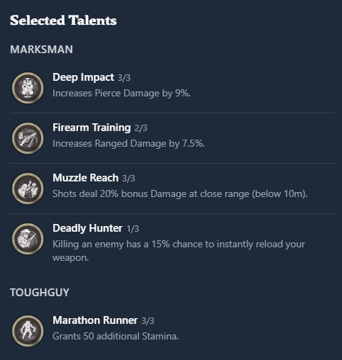 I don’t mind the reload time on either Musket or Blunderbuss, so I take Firearm Training to increase the single-shot damage, but if you find the reload annoying, take the Quick Hand talent. Finally, we have the Deadly Hunter x1. No need to max it out, since 15% procs more often than you’d think. It’s the only high-level perk that fits into this build.