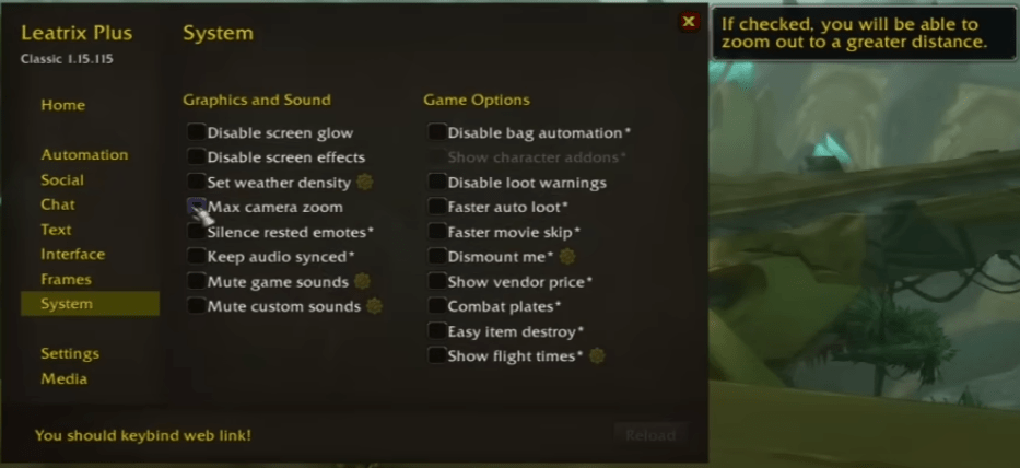 Leatrix Plus covers a bit of everything. It can automate boring tasks like quest turn-ins, repairs, and junk selling. It cleans up the UI by hiding unnecessary text, effects, and frames. It improves chat, tooltips, the minimap, vendors, the quest log, and even things like camera distance and sound behavior. You turn on only the features you care about and ignore the rest.