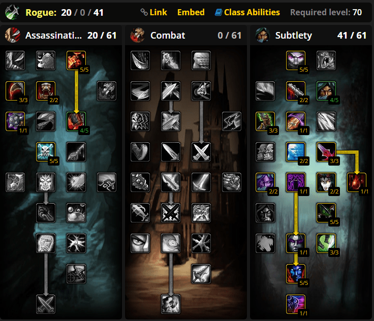 As the name suggests, this build is designed for PvP specifically. The most important talent here is located at the very bottom of the tree - Shadowstep. With it, you’ll have enough mobility and utility to keep yourself alive as long as you need. The other 20 points will go into the Assassination talent tree, where you’ll get rank 5 for Vile Poisons, so you get more damage out of them. Other than that, take note of the Master of Subtlety talent that gives you increased damage when jumping out of stealth.