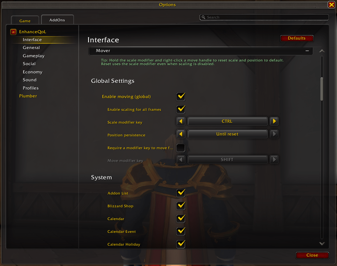 Go to the addon settings and select the Interface category. Scroll down to the bottom and expand the last option called “Mover”. In there, you’ll see a bunch of settings. Here’s what I chose and why: