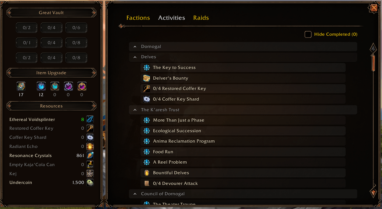 This one is for me. As someone who has zero idea about the kind of content I can do in any expansion, this window is a lifesaver. It lets me see all important quests and activities, track all faction reputation, check every raid and every boss inside for specific loot on any difficulty, and see all the currencies. Just enable this window in the settings and then click on the small icon under the calendar in the top right corner of the screen to open it. You can also set a custom keybind for this window. It’s also a movable window with the Enchance QoL addon!