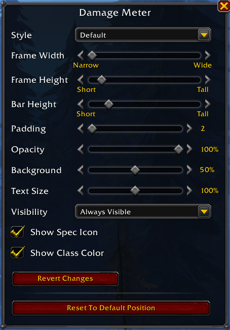 Reducing the width to the minimum frees up space but still keeps the damage meters very readable. Just doing that creates more problems - the text is overlapping, and the bars are too short. To fix the overlapping, bring the Bar Height up by four notches. This will give you the top-5 players by damage, leaving the rest on scroll.