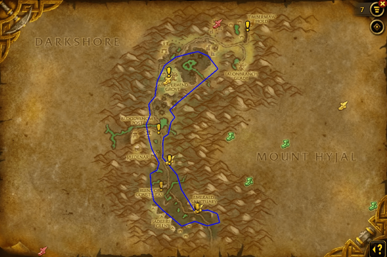 This route begins near the top of Felwood, just south of Timbermaw Hold. From there, follow the western edge of the treeline downward in a smooth, continuous path. Stay close to the mountain wall, as most lumber nodes spawn along the forest’s inner curve. Once you reach the lower part of the zone near Jadefire Glen, cut slightly east and move back up along the central forest path toward Whisperwind Grove. This return path is just as dense, letting you pick up every node that respawns behind you as you complete the loop.