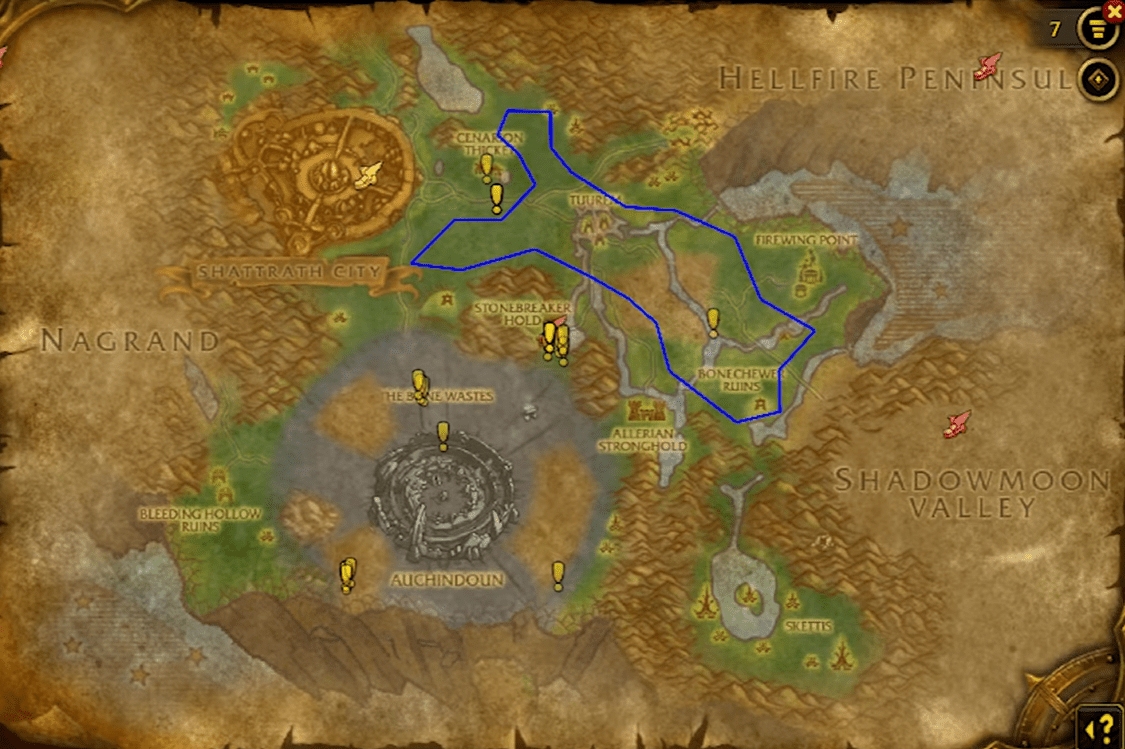- Start in Shadowmoon Valley, focusing on the wooded areas around Shaz’gul, Anguish Fortress, and the northern riverbanks.