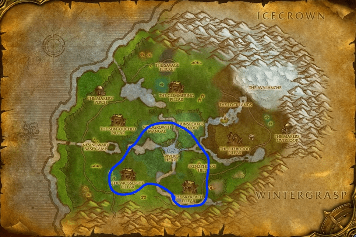 This route circles the southern and central portions of Sholazar Basin. Begin near The Skyreach Pillar and fly west toward The Mosslight Pillar, passing along the thick forest line that runs just above the basin’s southern rim. From there, turn north toward the River’s Heart and continue through the wide tree clusters around the Wodgrowth Mangla. When the route curves east, follow the treeline toward Frenzyheart Hill, then sweep back down toward The Skyreach Pillar to complete the loop.