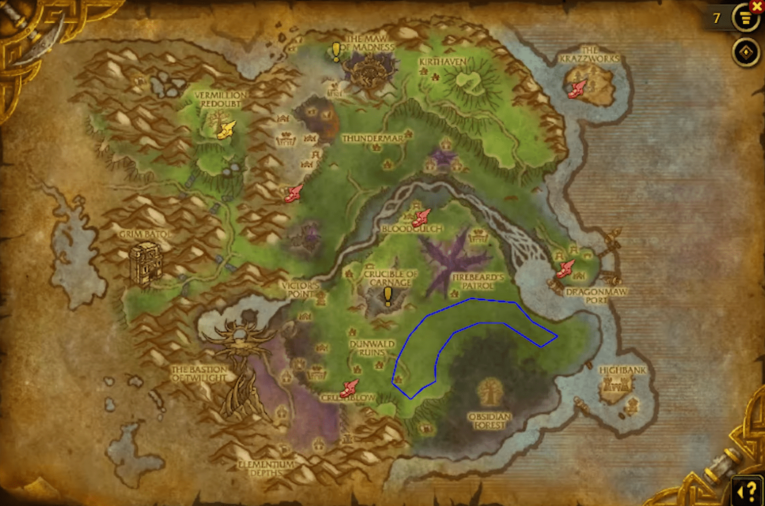 Twilight Highlands is one of the most reliable Cataclysm zones for gathering Ashwood Lumber thanks to its dense tree clusters and smooth, linear terrain. This route focuses on the southern edge of the zone, wrapping around the Obsidian Forest and leading up toward the Dunwald Ruins area. The treeline here is thick enough to guarantee frequent node spawns without forcing constant elevation shifts.