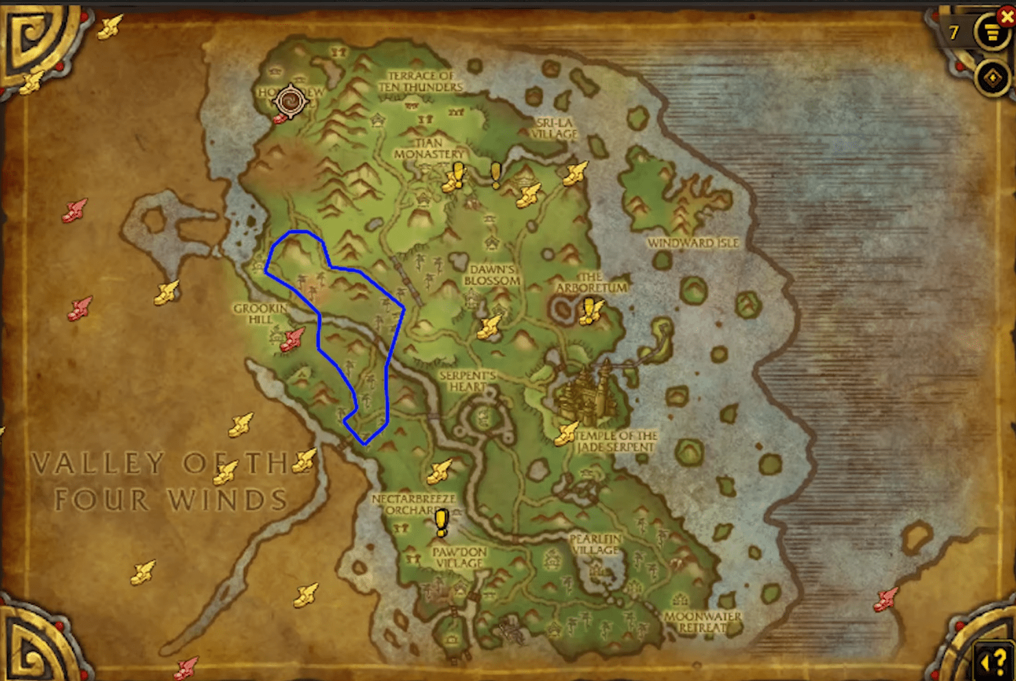 Begin your loop near Grookin Hill and work your way south along the forest line bordering the Valley of the Four Winds. The path curves east toward the low riverbeds, then rises back north along the cliffs that lead toward the Arboretum. The middle section of the route passes through some of the densest bamboo growth in Pandaria, creating a satisfying flow of tightly packed nodes.
