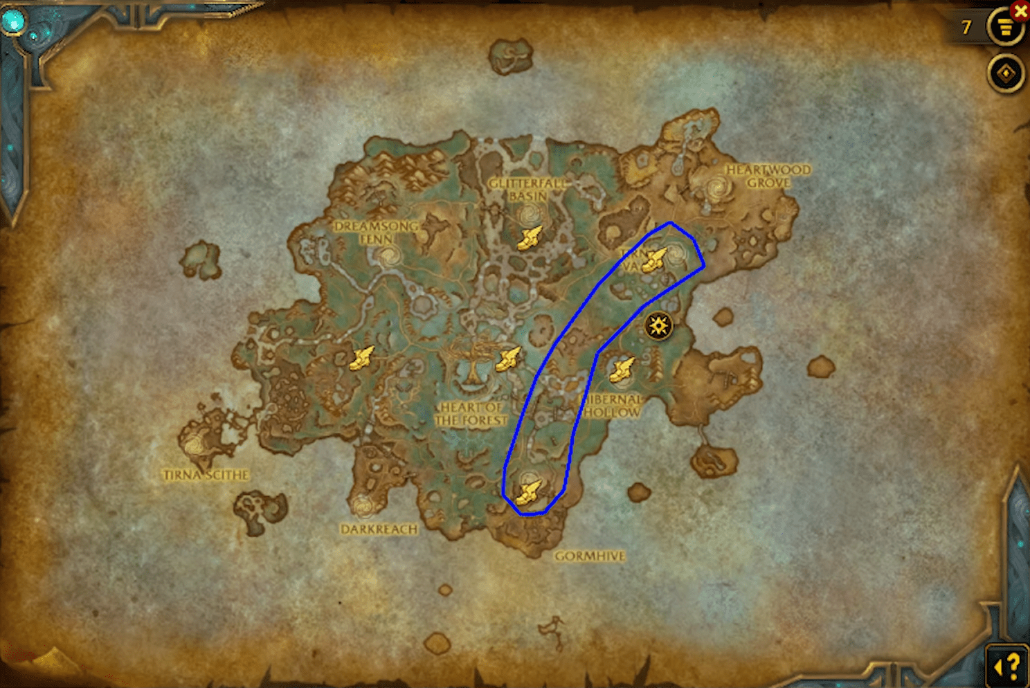 Arden Lumber is gathered across all Shadowlands outdoor zones, but Ardenweald is by far the strongest and most consistent farming location. The entire zone is built around dense forests, interconnected groves, and large clusters of trees—making it ideal for quick lumber loops. The route highlighted in your screenshot runs along the eastern edge of the zone, passing through Hibernal Hollow, Glitterfall Basin, and the forests surrounding Tirna Vaal. These areas generate node spawns at a high rate and allow for an uninterrupted farming flow.