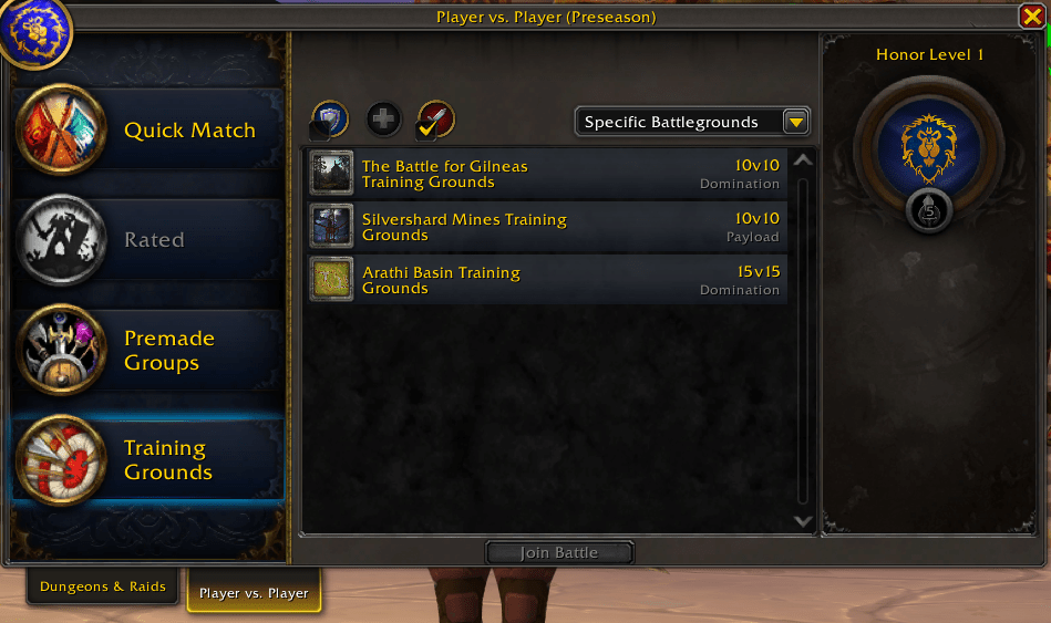 For those looking to get into instanced player vs player activities, you can now actually learn how things work by visiting the brand-new Training Grounds mode. In this mode, you’ll join a team of players and will play one of 3 battlegrounds against a team of AI bots. Which means, you’ll be able to learn how each BG works and what you need to do without risking letting your team down in a real BG against other players. Training Grounds mode is available from the PvP Group Finder, and you can either choose a random BG or a specific one: