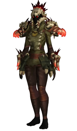 Primal Sentry's Camouflage is straight-up out of the Monster Hunter games. Every piece of this armor set is very clearly made out of some part of the beast's skeleton. The bracers, shoulder pads, and the helmet are all skulls and fangs; the back of the head, chest, and feet are clearly made of some beast’s scales, which makes it a very similar style to what you could see in the MH series.