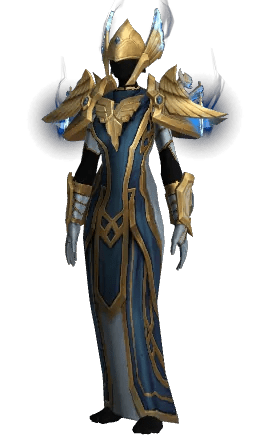 The Priest set for Season 1, Blind Oath's Burden, has a very unique justice theme going on. Despite most of the armor still being a cloth-made garb, the set does have lots of bulky, massive paladin-style elements, especially the helmet, shoulders, and bracers. The helmet has wings on both sides and armor pieces that cover the eyes. The wings remind me of Valkyries or Aesir, but closed-off eyesight reminds me of the Lady Justice. The biggest tell towards the justice theme is the shoulder pads that feature an inscribed human figure or statue that holds a sword with a blade pointed downward. I really admire the level of detail on this armor set.