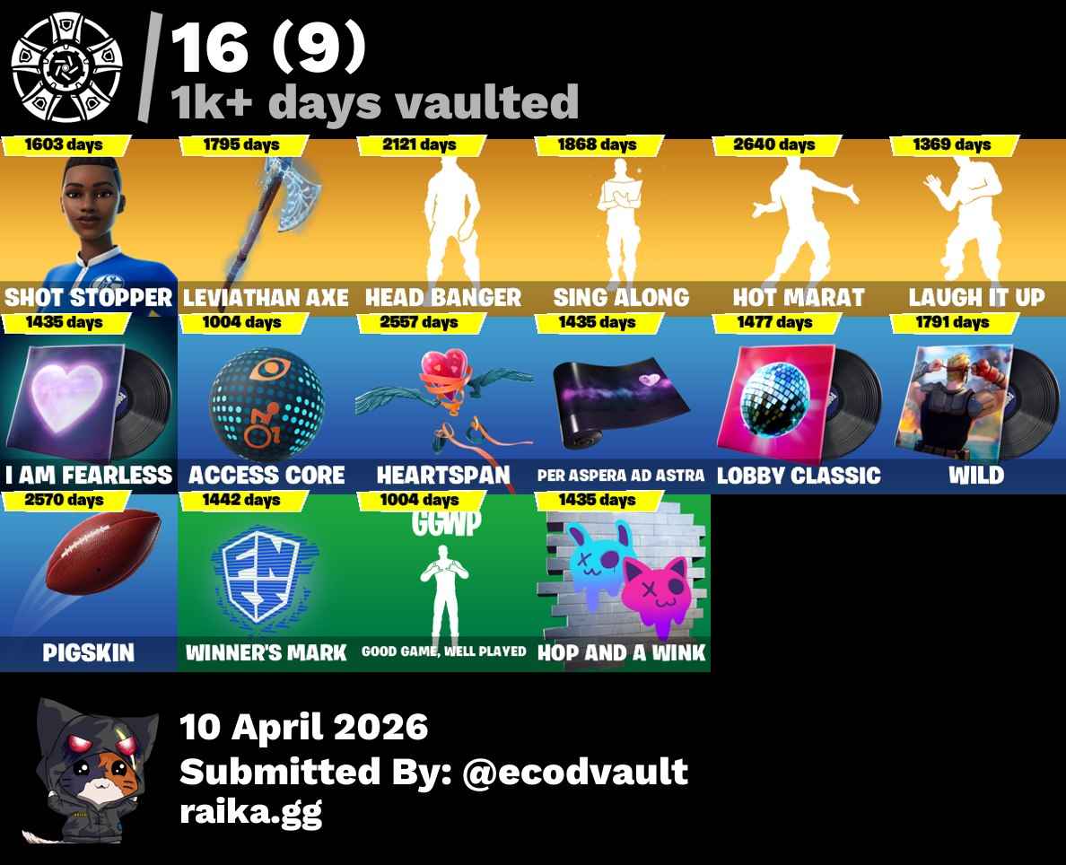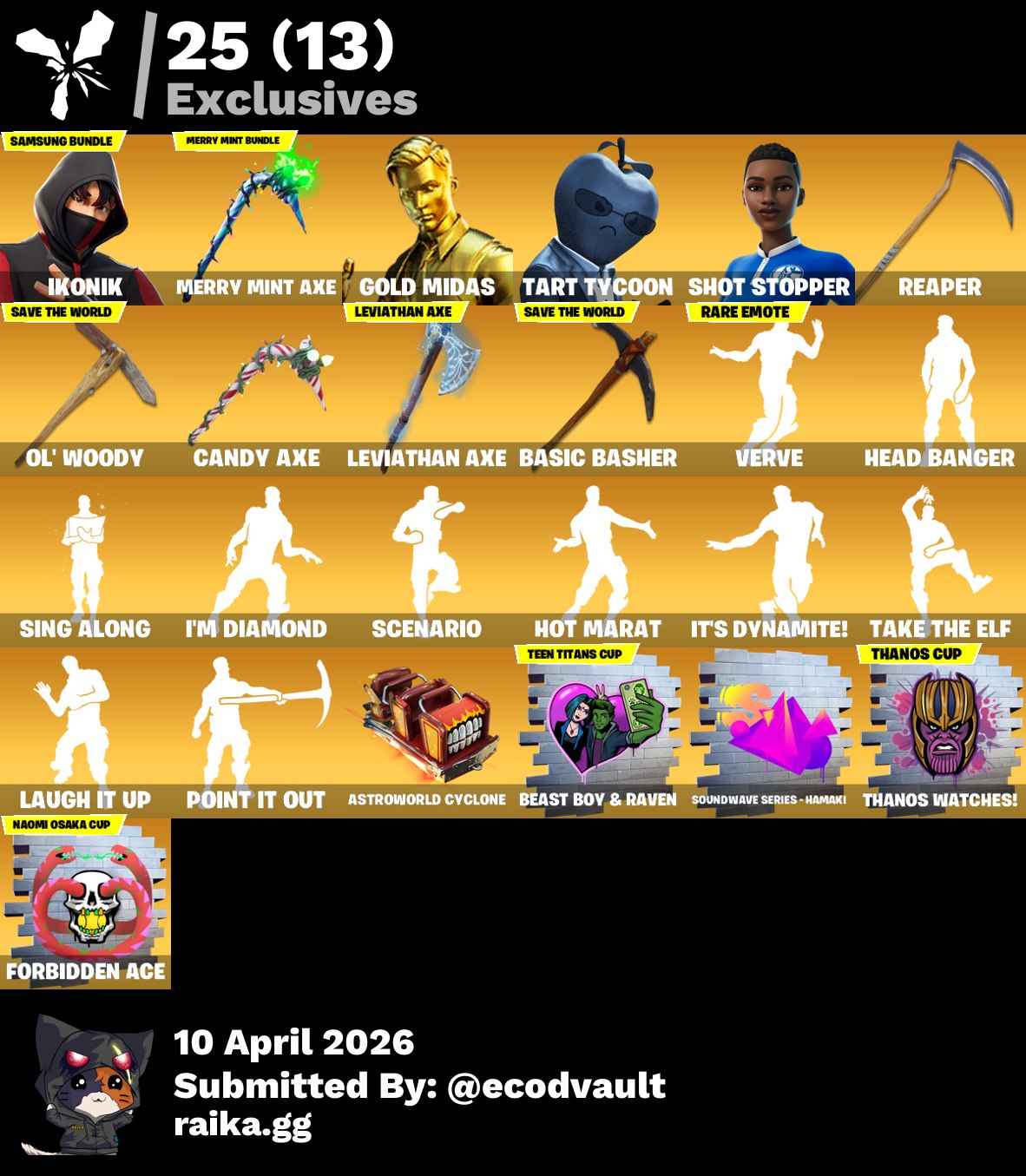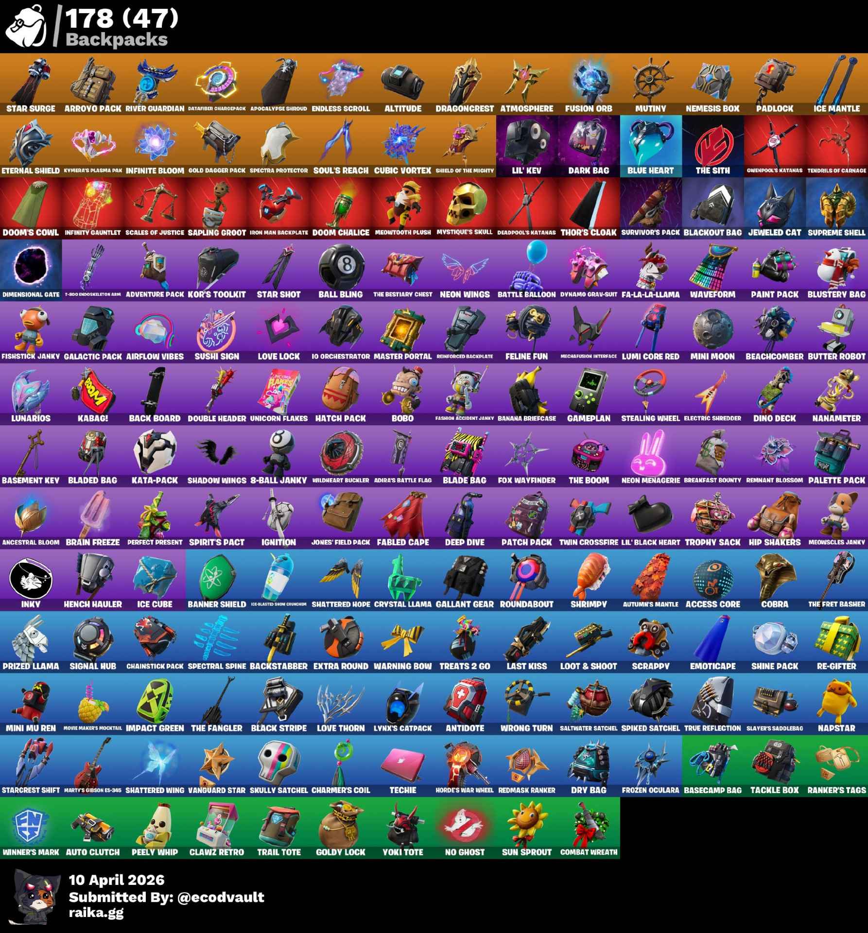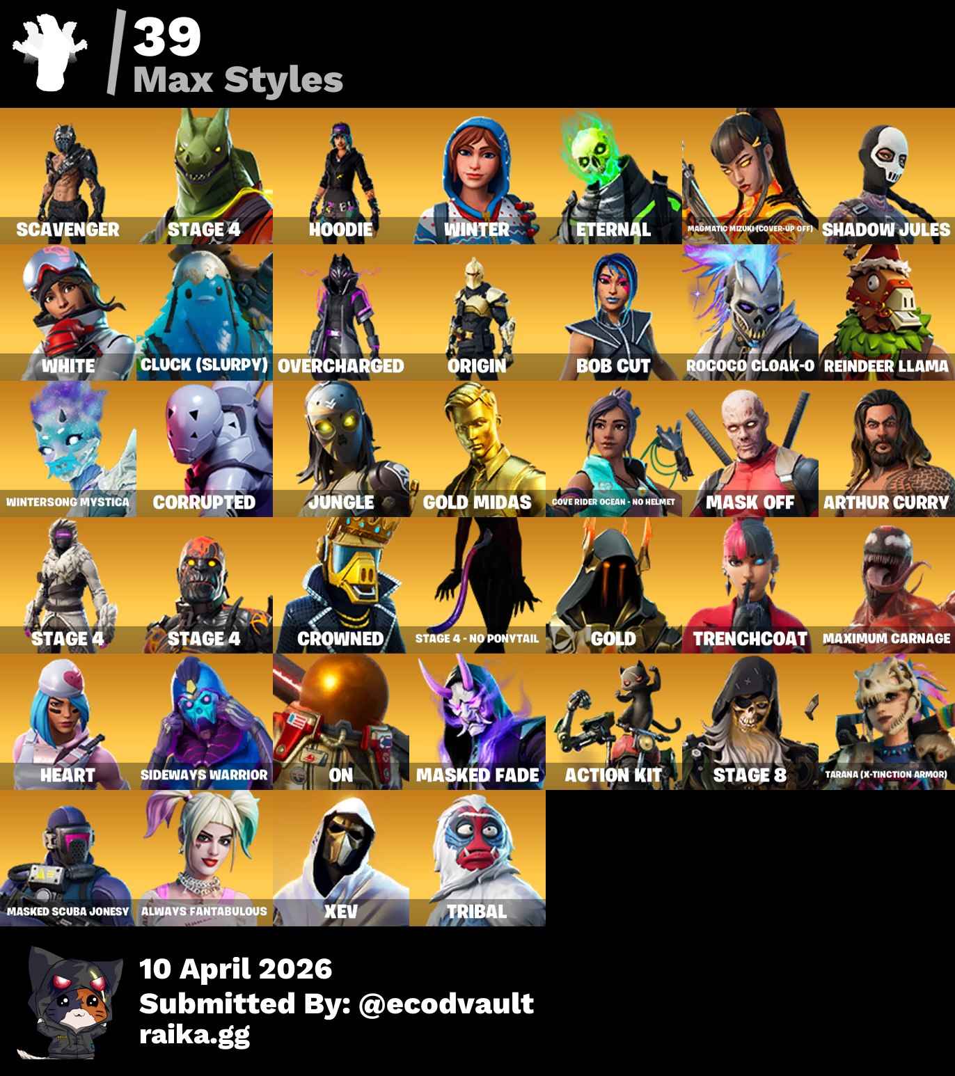 ๐ Maxed Skins: Deadpool, Jules, Sgt. Winter, J.B. Chimpanski, Y0ND3R, Powder, Catalyst, X-Lord, Eternal Voyager, The Prisoner, Scuba Jonesy, Hybrid, Tilted Teknique, Aquaman, Mandalorian, Carnage, Sparkle Supreme, Harley Quinn, Renzo the Destroyer, Lynx, Onesie, Zenith, Ocean, Ultima Knight, Kor, Mystica, Torin, Fade, Blackheart, Mizuki, Tarana