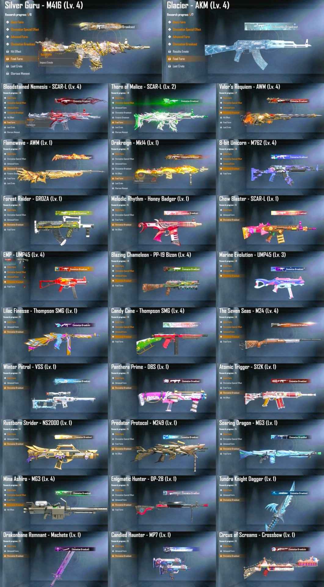 Lv. 4 (KILL MESSAGE): Silver Guru M416, Glacier AKM, Bloodstained Nemesis SCAR-L, Valor's Requiem AWM, 8-bit M762, EMP UMP45, Blazing Chameleon Bizon, Candy Cane Tommy, Seven Seas M24, Mina Ashiro MG3.