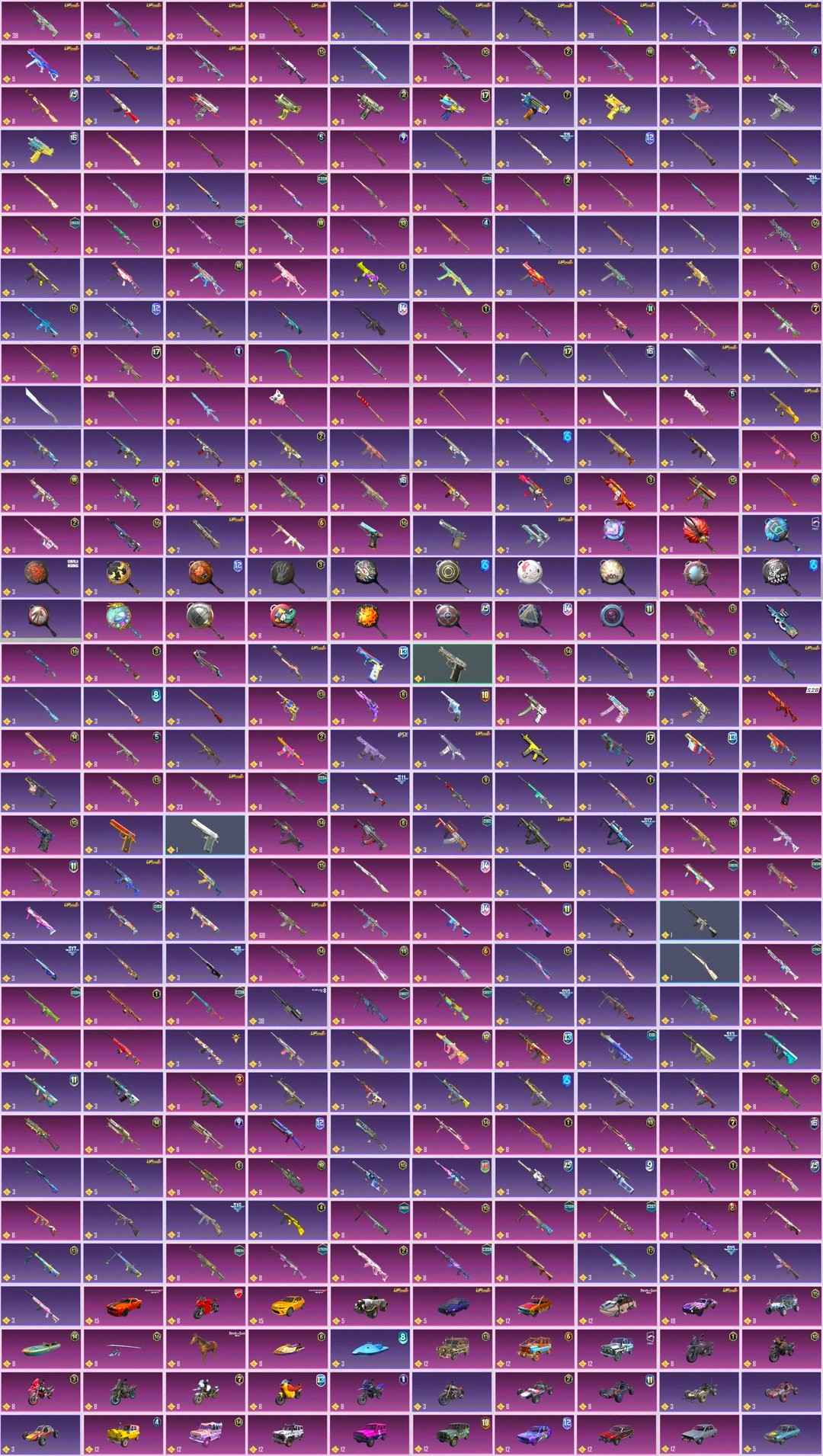 Lv. 1: Flamewave AWM, Mk14, Groza, Honey Badger, VSS, DBS, S12K, NS2000, M249, MG3, DP-28, Dagger, Machete, MP7, Crossbow.