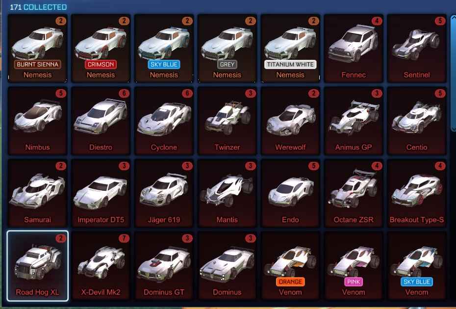 This account contains a large collection of painted cars including multiple Titanium White Nemesis, Grey Nemesis, Crimson Nemesis, Burnt Sienna Nemesis, Sky Blue Nemesis and several other painted bodies such as Fennec, Sentinel, Octane ZSR, Breakout Type-S, Nimbus, Diestro, Cyclone, Twinzer, Werewolf, Animus GP, Centio, Samurai, Imperator DT5, Jäger 619, Mantis, Endo, Venom, Dominus GT, X-Devil Mk2, Road Hog XL, Paladin, Merc, Hotshot, X-Devil, Road Hog, Vulcan, Triton, Proteus, Aftershock, Marauder, Masamune and Grog.